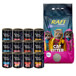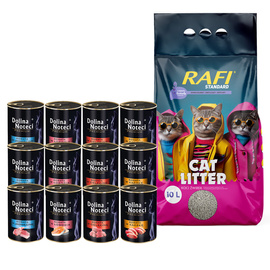 Dolina Noteci Premium Zestaw Mokra karma dla kota 12 x 400 g + Rafi Zbrylający żwirek o zapachu lawendy Compact 10 l