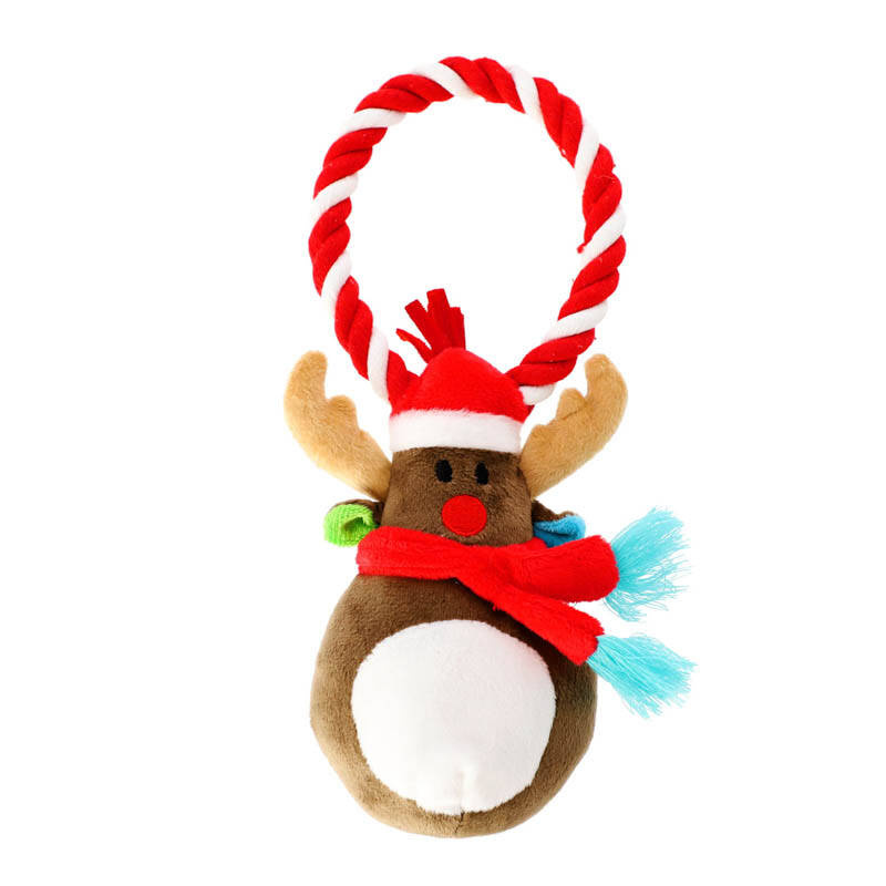 Pluszowy renifer umieszczony na plecionym, bawełnianym sznurze to idealna świąteczna zabawka do przeciągania dla psa.