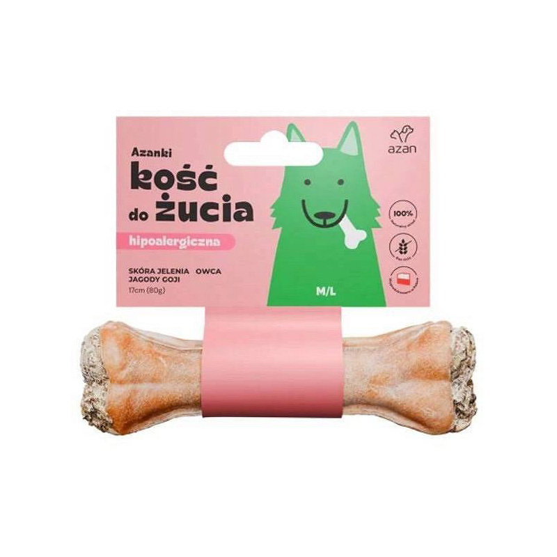 Azanki Kość do żucia M/L ze skóry jelenia z owcą i jagodami goji to wyśmienity przysmak dla dorosłych psów średnich i dużych ras, zaspokajający ich naturalną potrzebę gryzienia i żucia. Kości nie zawierają ostrych i kruchych elementów, stanowiąc bezpieczniejszą alternatywę dla rozmaitych gryzaków.