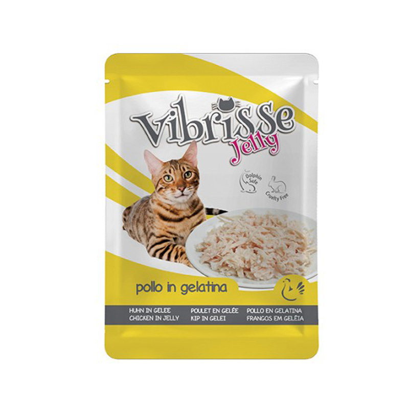 Odkryj mokrą karmę dla kotów o zróżnicowanych i apetycznych naturalnych smakach Vibrisse Jelly jest w sześciu smakach z kurczakiem, tuńczykiem, tuńczykiem i krewetkami, tuńczykiem i białą rybą, tuńczykiem ,szynką z kurczaka, tuńczykiem i wołowiną.
