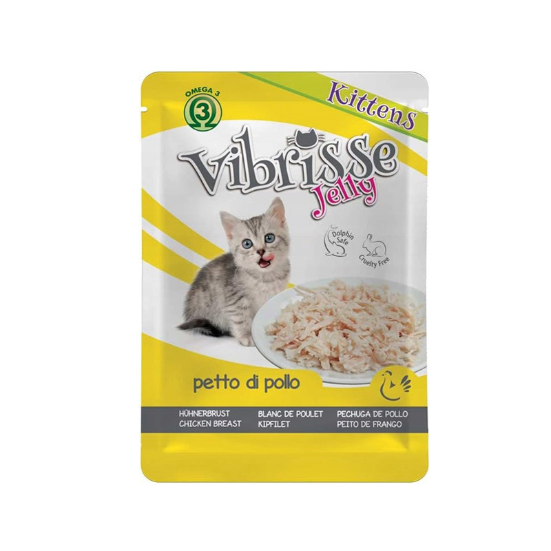 Vibrisse saszetka Jelly Kitten to całkowicie naturalna, uzupełniająca mokra karma dla kotów przygotowana ze starannie dobranych, wysokiej jakości składników, idealna dla kociąt. Stworzona po to aby dostarczać odpowiednich witamin i soli mineralnych oraz zaspokoić zapotrzebowanie energetyczne kociaka. Do wyboru są tuńczykiem z kurczakiem i pierś z kurczaka.