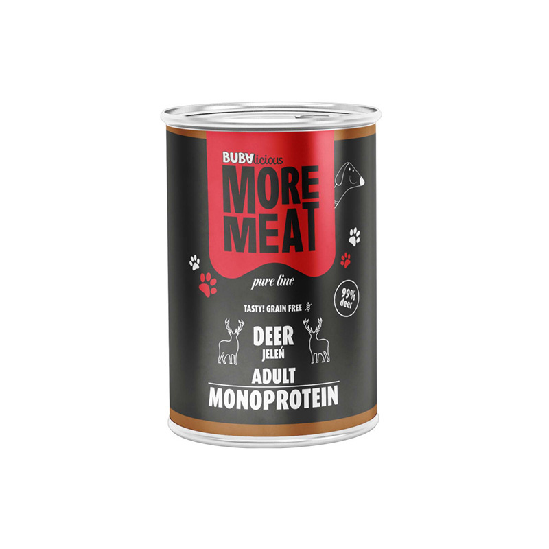 Wysokiej jakości karma mokra dla psa BUBAlicious More Meat Pure Line zawiera aż 99% jelenia, który wspiera rozwój mięśni, regenerację tkanek oraz ogólną kondycję organizmu. Mięso jelenia jest doskonałym źródłem żelaza, cynku, fosforu oraz witamin z grupy B, które wpływają pozytywnie na zdrowie układu nerwowego, odpornościowego oraz krwionośnego.