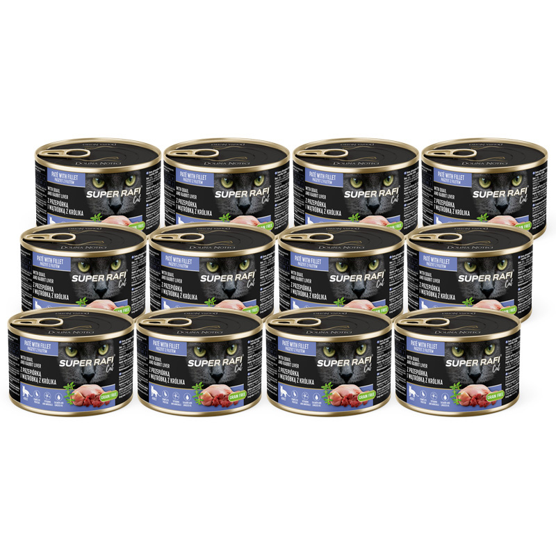 Karma mokra dla kotów Super Rafi Cat z przepiórką i wątróbką z królika zestaw 12 x 185 g