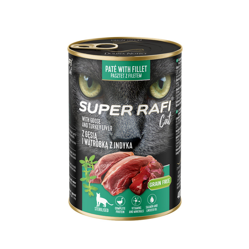 Formuła Super Rafi Cat z gęsią i wątróbką z indyka została opracowana specjalnie z myślą o kotach po zabiegu sterylizacji. Zredukowana zawartość tłuszczu oraz wzbogacenie receptury w L-karnitynę i DL-metioninę wspomagają utrzymanie prawidłowej masy ciała oraz zdrowia układu moczowego.