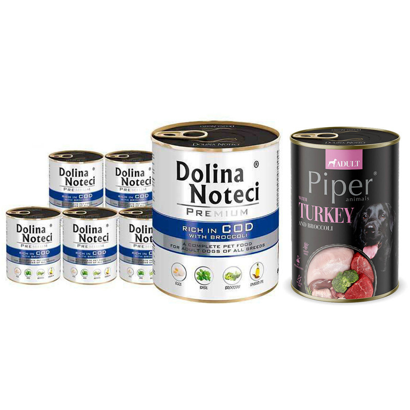Mokra karma dla psa Dolina Noteci Premium bogata w dorsza z brokułami zestaw 6 x 800 g + Piper Animals z indykiem i brokułem 400 g Gratis