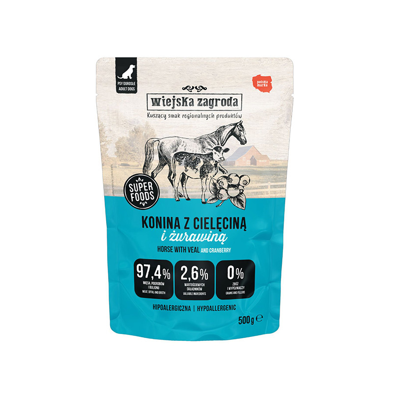 Wiejska Zagroda Konina z cielęciną i żurawiną to zdrowy wybór dla psa – codzienna porcja smaku i wartości odżywczych w wygodnym opakowaniu 500 g.