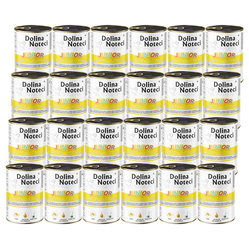 Mokra karma dla psa junior Dolina Noteci Premium bogata w żołądki z kurczaka zestaw 24 x 400 g