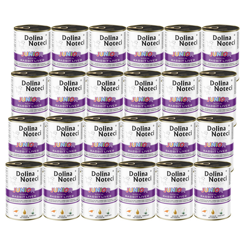 Mokra karma dla psa junior Dolina Noteci Premium bogata w wątróbkę z królika zestaw 24 x 400 g