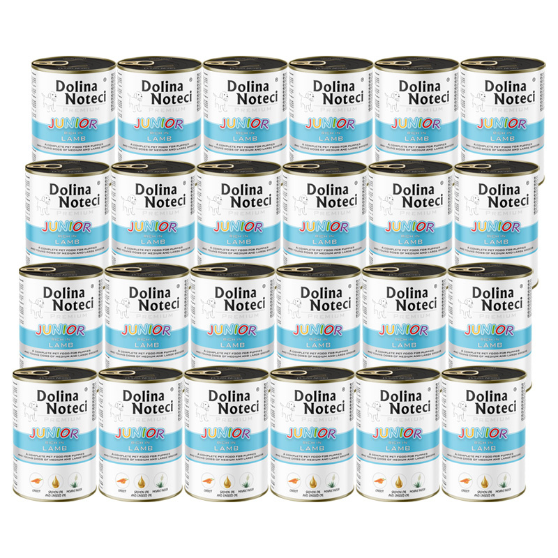 Mokra karma dla psa junior Dolina Noteci Premium bogata w jagnięcinę zestaw 24 x 400 g