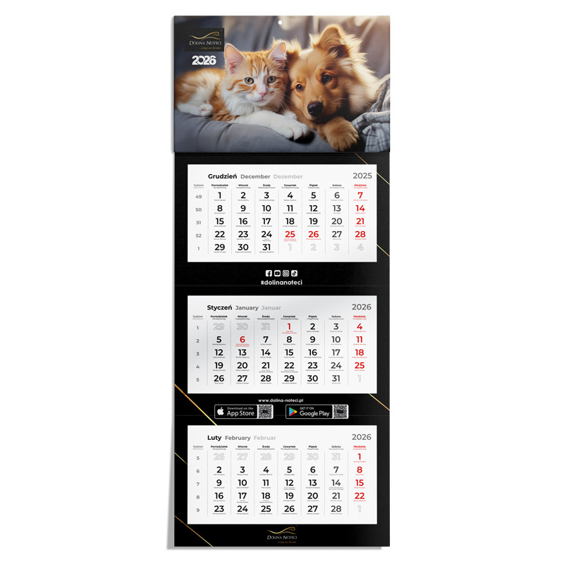 Kalendarz ścienny 2026 trójdzielny Pies i kot
