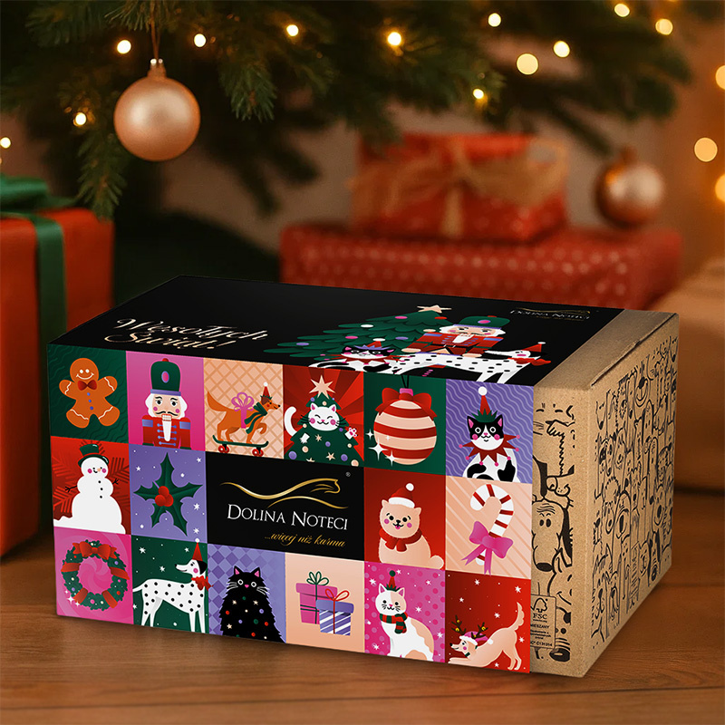 Zestaw wzbogacają dwa rodzaje karm suszonych z jagnięciną i dorszem oraz dwie zabawki: urocza mysz „Mikołaj” i jajko-niespodzianka z pysznym kąskiem. To subtelna, luksusowa propozycja, która łączy smak, zabawę i odrobinę świątecznej magii.