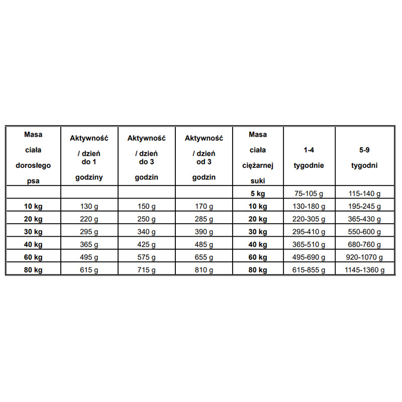Zalecana dzienna ilość karmy dla jednego zwierzęcia. Ilość karmy należy zmniejszyć, jeśli na przykład podawane są również przekąski. Zwierzę zawsze musi mieć dostęp do świeżej wody do picia.