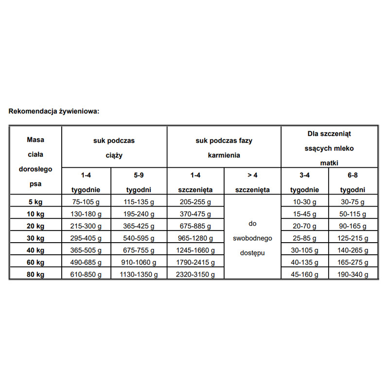 Szczenięta ssące mleko matki: Zalecana dzienna ilość karmy dla jednego zwierzęcia. Podane ilości karmy są oparte na masie ciała dorosłego psa. Pokarm należy rozłożyć na kilka posiłków dziennie i do końca 6. tygodnia życia podawać karmę w formie rozdrobnionej i namoczonej w wodzie (37°C). Pozostałości posiłku należy usunąć. Ilość karmy podawanej szczeniętom zależy od wieku szczeniąt, ilości mleka produkowanego przez sukę, zachowania podczas ssania i indywidualnego rozwoju szczeniąt.
