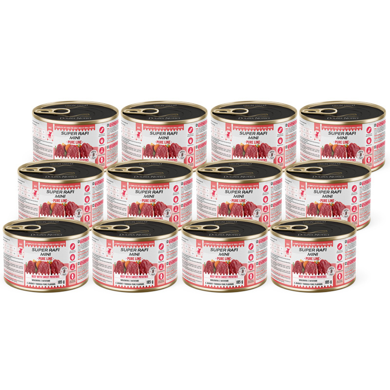 Super Rafi Mini Pure Line Mokra karma dla psów małych ras z wołowiną i batatami zestaw 12 x 185 g