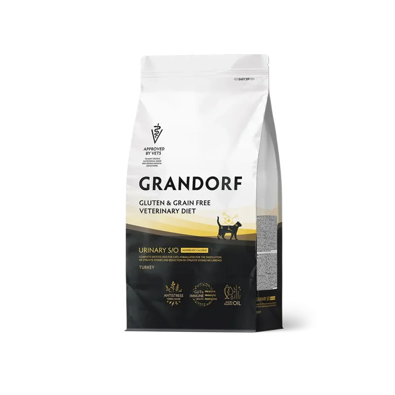 Grandorf Urinary S/O Moderate Calorie to karma o umiarkowanej wartości energetycznej, dzięki czemu może być stosowana w kontrolowaniu masy ciała kota. W przypadku kotów z tendencją do kamicy moczowej, ta karma weterynaryjna jest szczególnie zalecana do stosowania przez 5–12 tygodni, aby rozpuścić kamienie struwitowe, oraz przez do 6 miesięcy, aby ograniczyć ich nawrót. Ważne jest, aby przed zastosowaniem lub kontynuacją tej diety skonsultować się z lekarzem weterynarii, aby dostosować terapię dietetyczną do potrzeb zdrowotnych pupila.