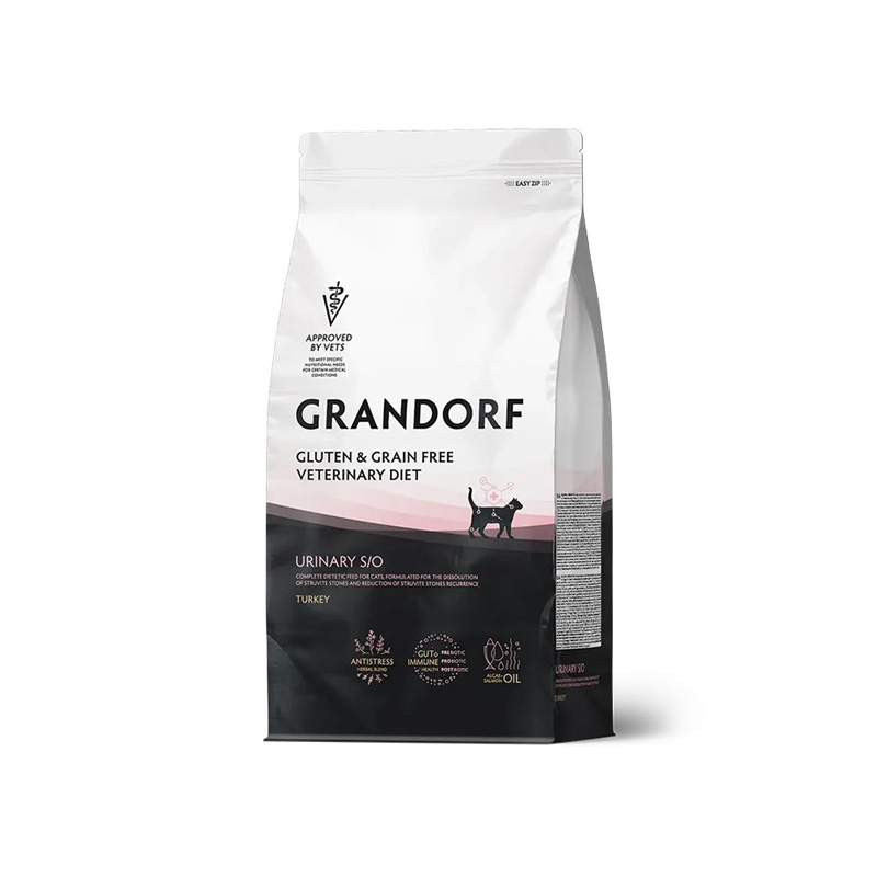 - Grandorf Urinary S/O Moderate Calorie wspiera zdrowe drogi moczowe kota, pomagając rozpuszczać kamienie struwitowe dzięki niskiej zawartości magnezu.