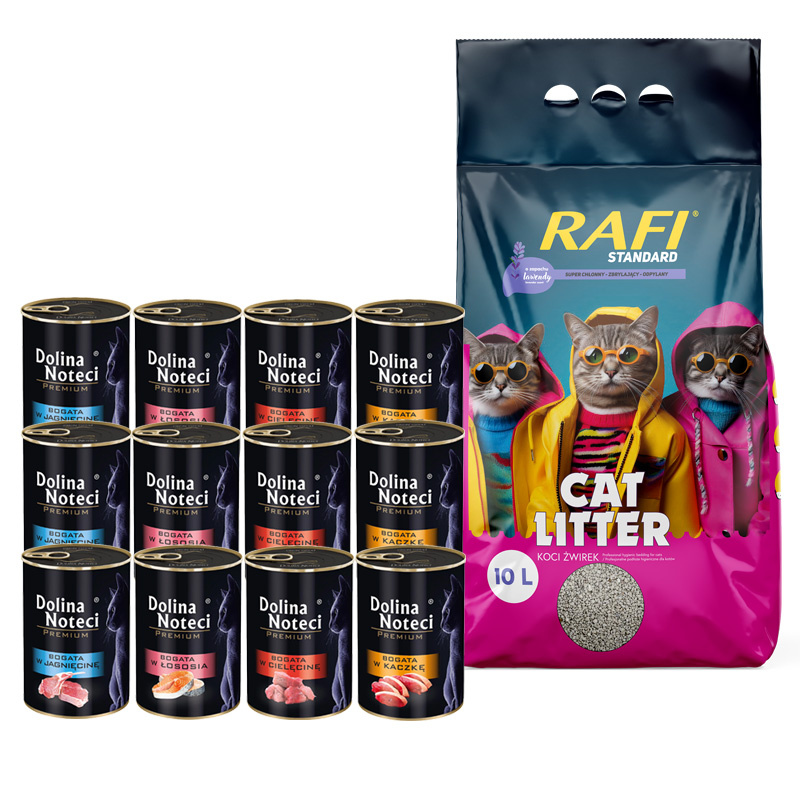 Dolina Noteci Premium Zestaw Mokra karma dla kota 12 x 400 g + Rafi Zbrylający żwirek o zapachu lawendy Standard 10 l