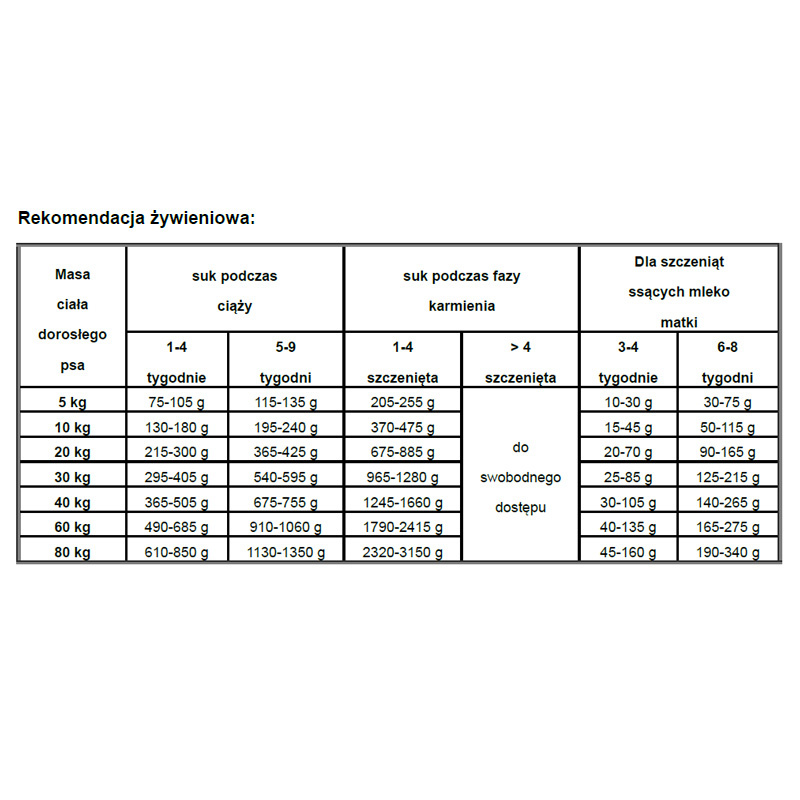Zalecana dzienna ilość karmy dla jednego zwierzęcia. Podane ilości karmy są oparte na masie ciała dorosłego psa. Pokarm należy rozłożyć na kilka posiłków dziennie i do końca 6. tygodnia życia podawać karmę w formie rozdrobnionej i namoczonej w wodzie (37°C). Pozostałości posiłku należy usunąć. Ilość karmy podawanej szczeniętom zależy od wieku szczeniąt, ilości mleka produkowanego przez sukę, zachowania podczas ssania i indywidualnego rozwoju szczeniąt.