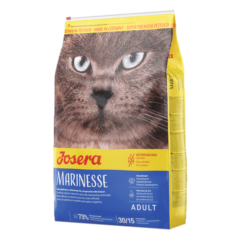 Josera Marinesse z wysoką zawartością pysznego łososia jest optymalnym pokarmem dla kotów lubiących ryby. Unikalna formuła zawiera tylko dobrze tolerowane białka, bez dodatku zbóż. Dzięki temu jest idealna dla kotów cierpiących na nietolerancję pokarmową oraz z wrażliwym układem pokarmowym.