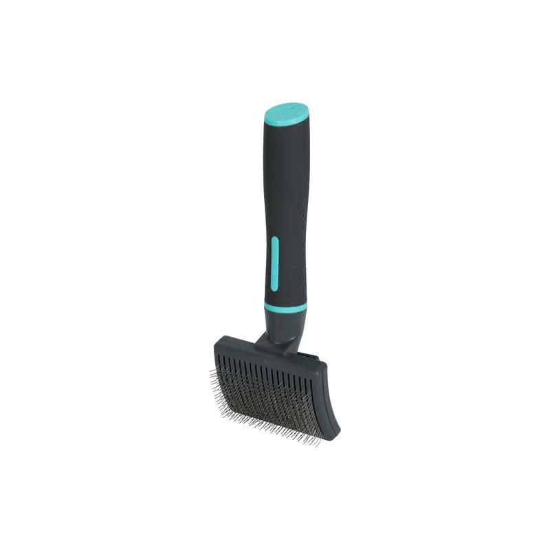 SZCZOTKA PUDLÓWKA Z WYSUWANYMI IGŁAMI MAŁA - elastyczne, zakrzywione igły umożliwiają delikatne szczotkowanie podszerstka. Dzięki wysuwanym igłom szczotka jest wygodna w użyciu i łatwa do utrzymania w czystości. Rozczesuje, usuwa martwy podszerstek i wygładza sierść.