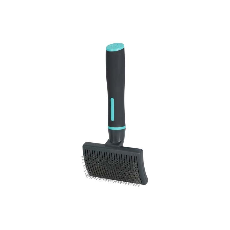 SZCZOTKA PUDLÓWKA Z WYSUWANYMI IGŁAMI ŚREDNIA - elastyczne, zakrzywione igły umożliwiają delikatne szczotkowanie podszerstka. Dzięki wysuwanym igłom szczotka jest wygodna w użyciu i łatwa do utrzymania w czystości. Rozczesuje, usuwa martwy podszerstek i wygładza sierść.