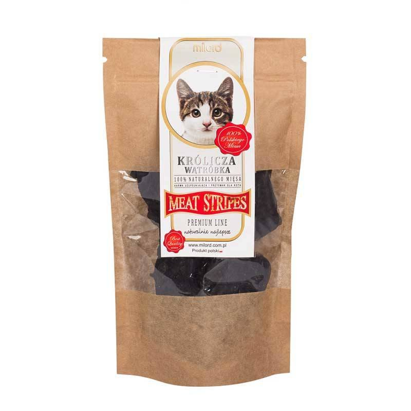 Naturalny smakołyk dla kota w postaci suszonego mięsa z wątroby królika to doskonała przekąska, która urozmaici jego codzienną dietę. Ten przysmak dla kota nie zawiera konserwantów, wypełniaczy ani polepszaczy smaku. Dzięki temu jest on bezpieczny dla pupili w każdym wieku. Dzięki procesowi suszenia ciepłym powietrzem produkt zachowuje swoje właściwości, a jednocześnie jest chrupiący i kruchy. Delikatne mięso z wątroby królika zapewnia wysokojakościowe białko i witaminy z grupy A, B, C, D i K. Jest również bogate w żelazo, wapń, kwas foliowy i niacynę. Poza bogactwem witamin i minerałów, z pewnością doda kotu energii.
