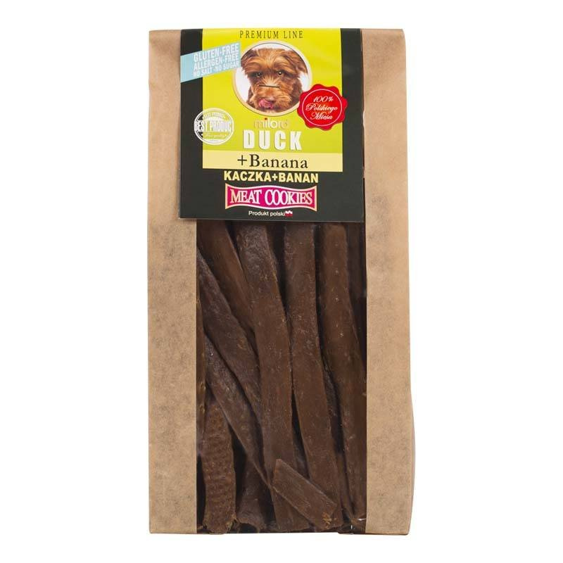 Kruche ciastka dla psa, składające się w 100% z naturalnych składników. Powstają one w procesie suszenia mięsa z kaczki i banana w proporcjach 75% kaczki i 25% banana. Ciastka Milord Meat Cookies zachowują swoje walory smakowo-zapachowe, bez potrzeby dodawania do nich konserwantów czy barwników, są bezpieczne nawet dla czworonogów z alergiami, a białko w nich zawarte jest łatwo przyswajalne.