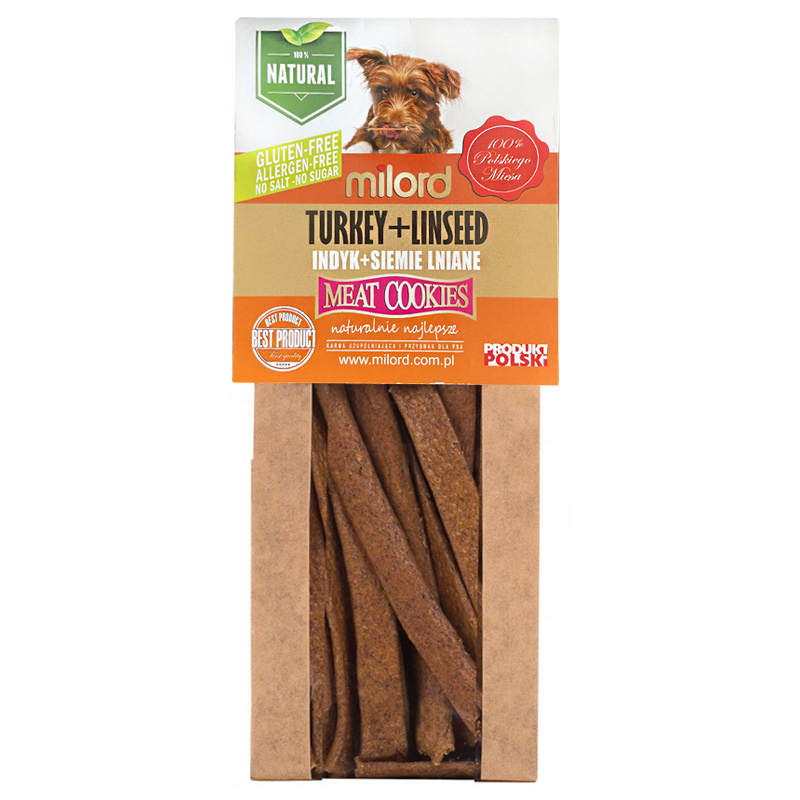 Wyjątkowo smakowite ciastka dla psa, które powstały w procesie suszenia mięsa z indyka. Odpowiednio dobrane proporcje 75% mięsa i 25% siemienia lnianego wpływają na wyjątkową smakowitość produktu, wspierając układ pokarmowy, ponieważ siemię lniane zmniejsza stan zapalny. Ciastka Milord Meat Cookies zachowują swoje walory smakowo-zapachowe, bez potrzeby dodawania do nich konserwantów, barwników i wzmacniaczy smaku. Ciastka są bezpieczne nawet dla czworonogów z alergiami, a białko w nich zawarte jest łatwo przyswajalne.