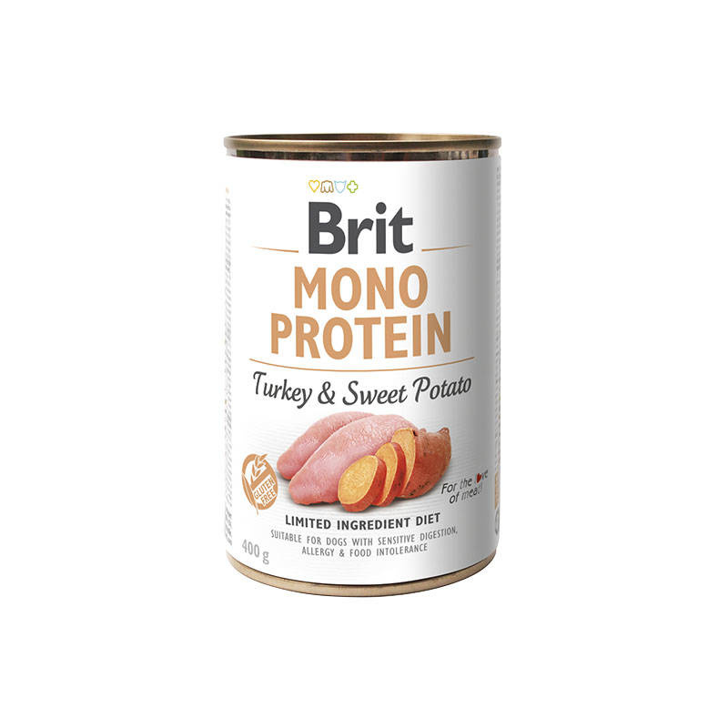 BRIT MONO PROTEIN TURKEY & SWEET POTATO PEŁNOPORCJOWA KARMA WILGOTNA Z INDYKIEM I BATATAMI DLA PSÓW WSZYSTKICH RAS. ODPOWIEDNIA DLA PSÓW Z WRAŻLIWYM PRZEWODEM POKARMOWYM, ALERGIĄ I NIETOLERANCJĄ POKARMOWĄ