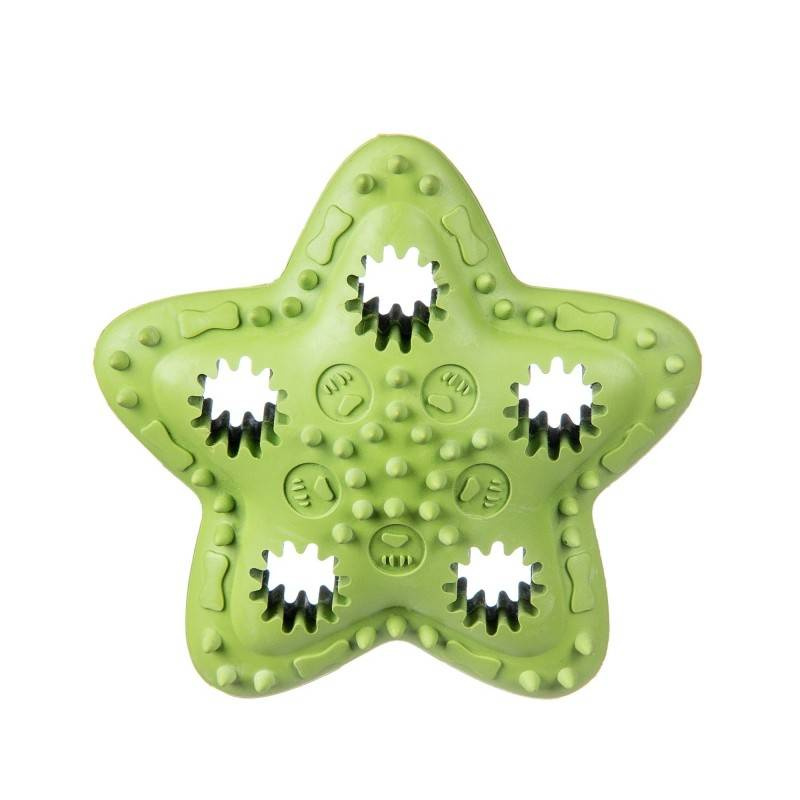 Super wytrzymała zabawka w kształcie gwiazdy od marki Barry King. Wykonana z wysokiej jakości kauczuku, zapewnia długie godziny świetnej zabawy. Idealna do tresury a także aportowania. Produkt posiada aż pięć otworów, w które można włożyć ulubiony przysmak pupila. Masuje dziąsła i wpływa korzystanie na higienę jamy ustnej psa. W intensywnym, zielonym kolorze. Produkt ma 12,5cm wielkości.
