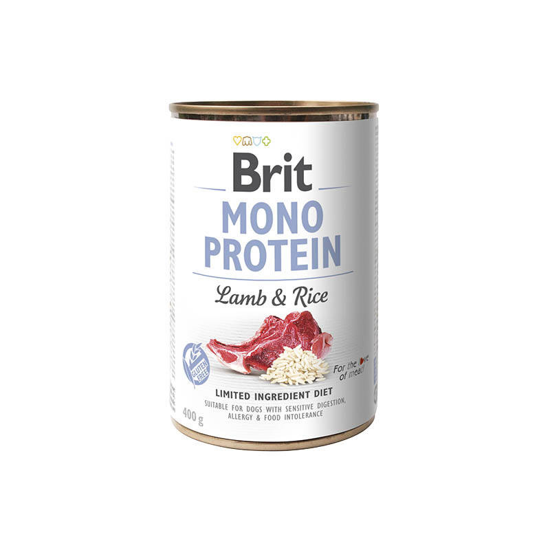 Brit Mono Protein lamb & rice pełnoporcjowa karma wilgotna z jagnięciną i ryżem dla psów wszystkich ras. Odpowiednia dla psów z wrażliwym przewodem pokarmowym, alergią i nietolerancją pokarmową.